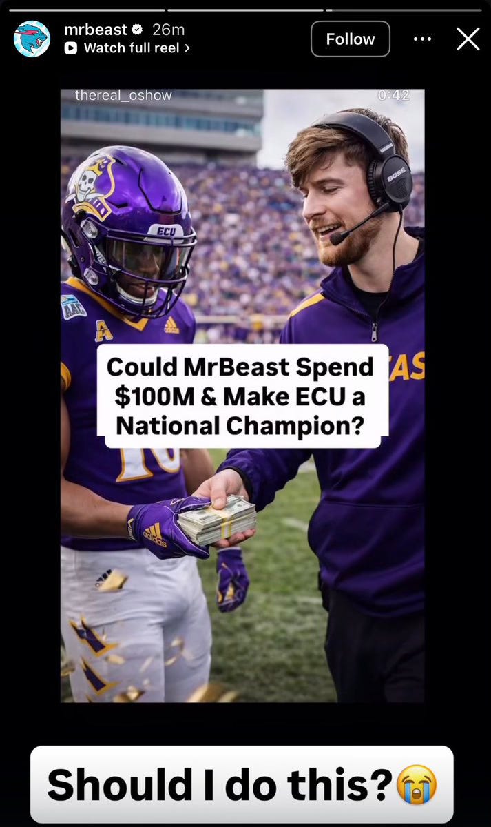 On 3 February, an Instagram story appeared. Not a press release. An AI image of Jimmy Donaldson handing cash to an East Carolina University football player, captioned: “Should I do this?”