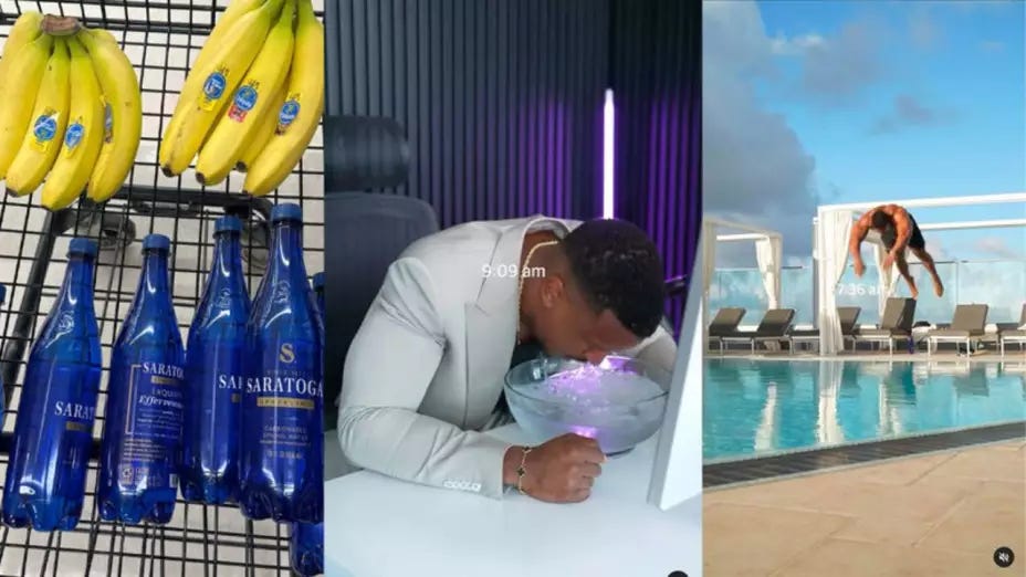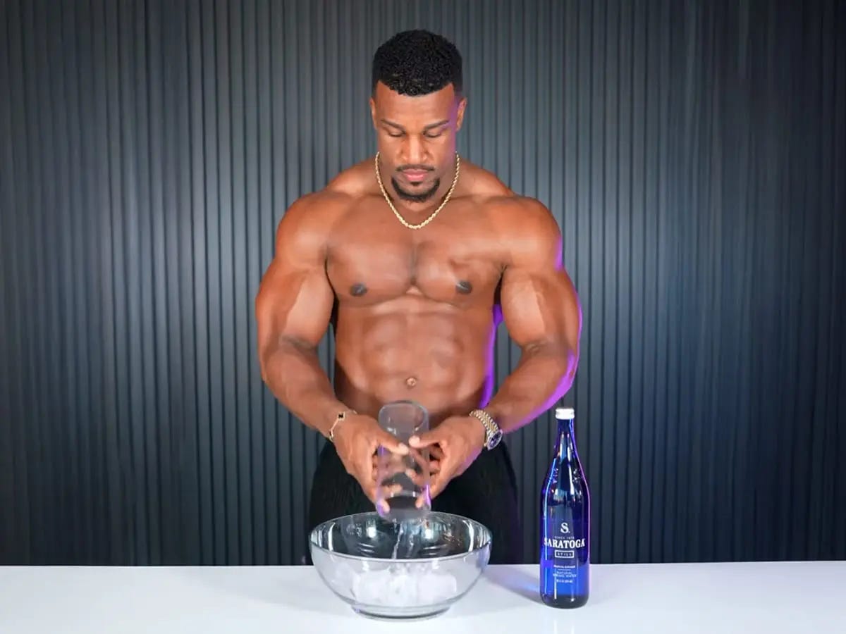 Ashton Hall's elaborate morning routine featuring Saratoga Spring Water's distinctive blue glass bottles has transformed a regional premium beverage into a viral phenomenon. The video, which garnered nearly 100 million views, showcases creator Ashton Hall repeatedly using the water for drinking and as part of his face-dunking ice bath ritual.